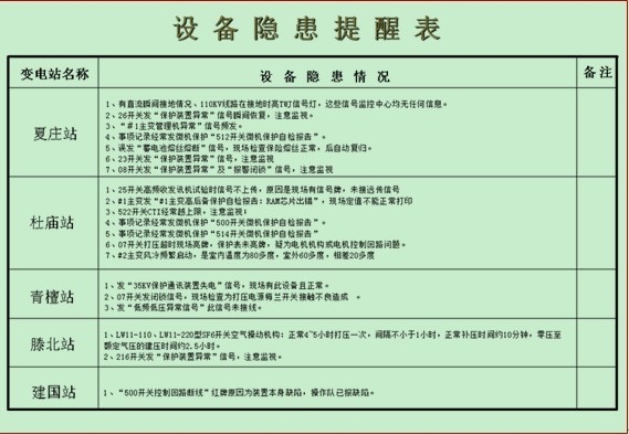 2.1 設(shè)備隱患提醒表:匯總變電站存在的異常信號(hào),且在短時(shí)間內(nèi)無法處理的隱患(例如:滕北站發(fā)“216開關(guān)保護(hù)裝置異!卑l(fā)后隨即復(fù)歸,檢修部門無法捕捉檢查)。監(jiān)控值班員在監(jiān)控過程中,可以通過此表跟蹤并加強(qiáng)監(jiān)視,及時(shí)匯報(bào),提高值班員的判斷能力。